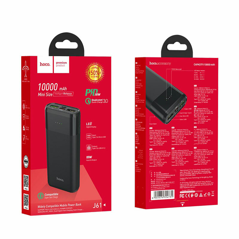 10 цен на Универсальный Доп. Аккумулятор 10000mAh, J61, PD 18W+QC3.0, Hoco, черный