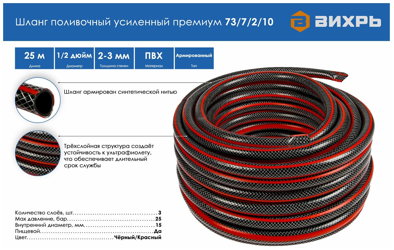Шланг Вихрь 73/7/2/10 1/2" 25м черный/красный информация: