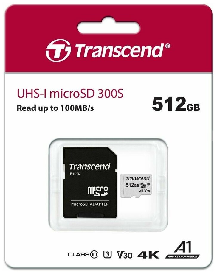 Карта памяти microSDXC UHS-I U3 Transcend 300S 512 ГБ, 100 МБ/с, Class 10, TS512GUSD300S-A, 1 шт., переходник SD