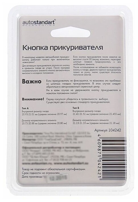 Отзывы на Кнопка прикуривателя 12 В гнездо D=20,97 мм Autostandart *СС AUTO-STANDART 104242 | цена за 1 шт | минимальный заказ 1