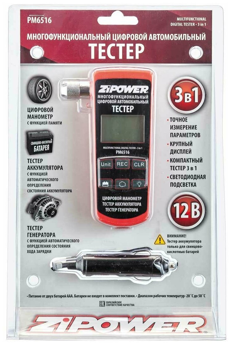 Отзывы на ZIPOWER PM6516 Тестер многофункциональный цифровой "ZIPOWER" (3 в 1, цифровой манометр, тестер АКБ, тестер генератора)
