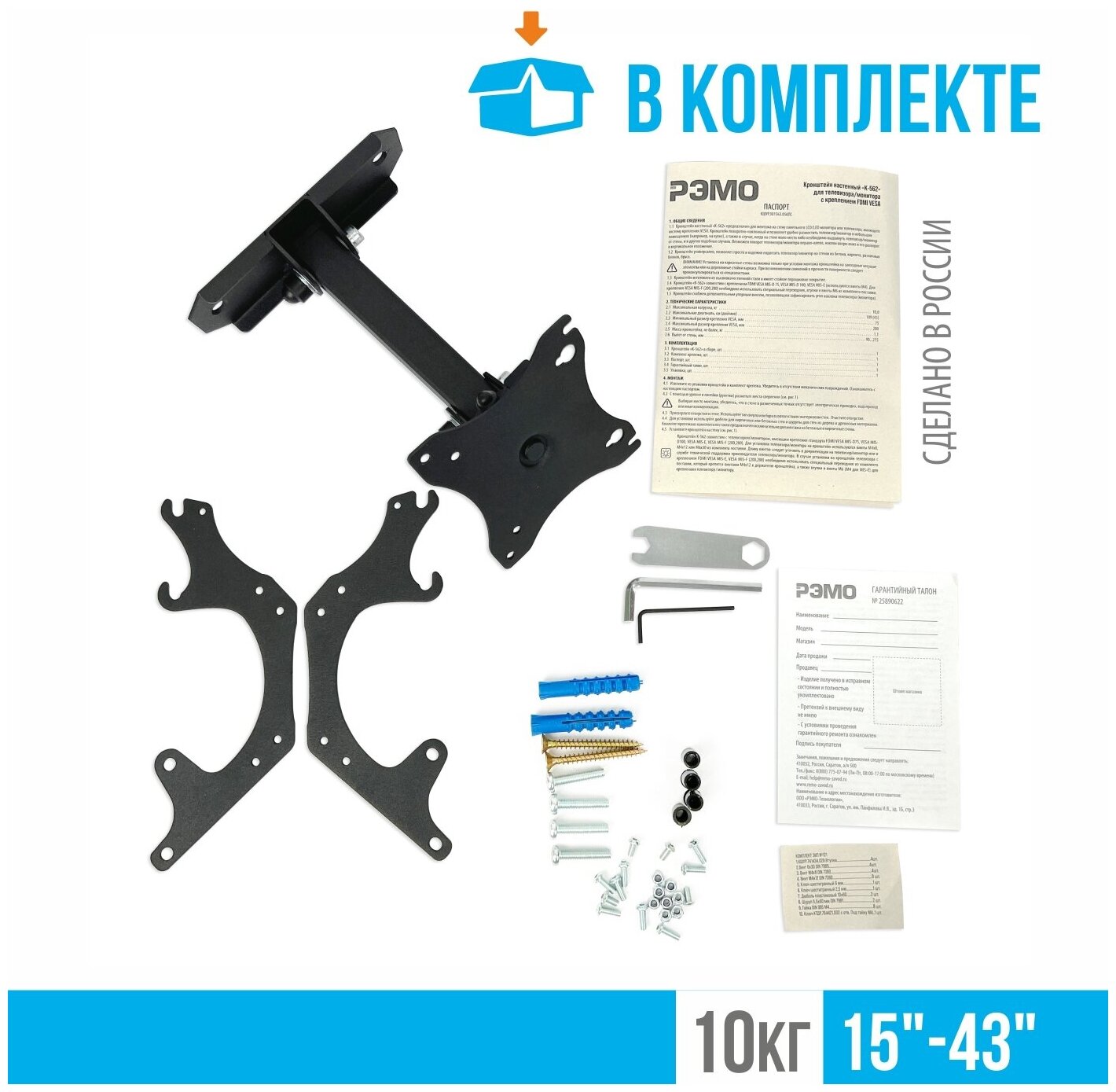 Надежный настенный кронштейн РЭМО K-543, наклонно-поворотный 15"-43", крепление VESA 75*75, 100*100 и 200*200 мм