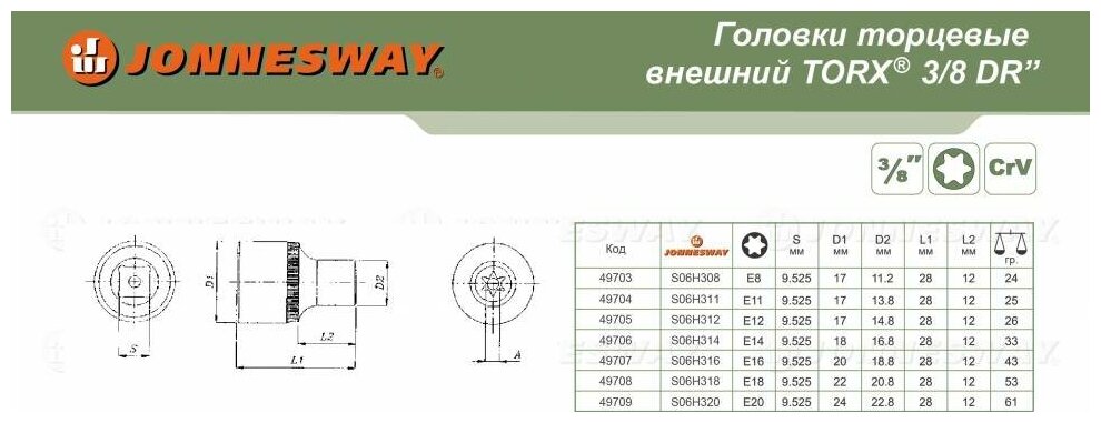 Торцевая Головка 3/8"Dr Внешний Torx Е-11 49704_Пл Jonnesway арт. S06H311 информация: