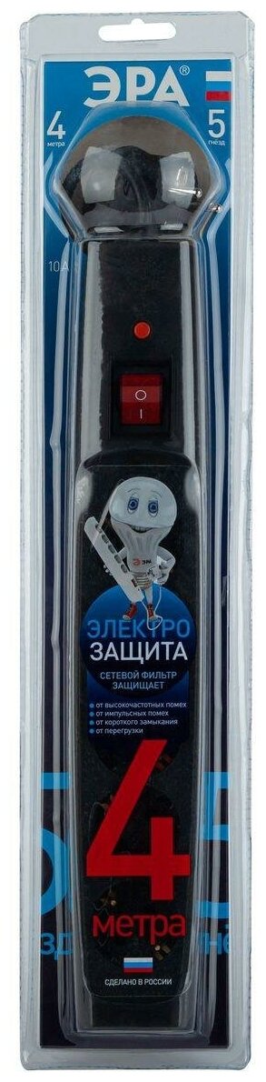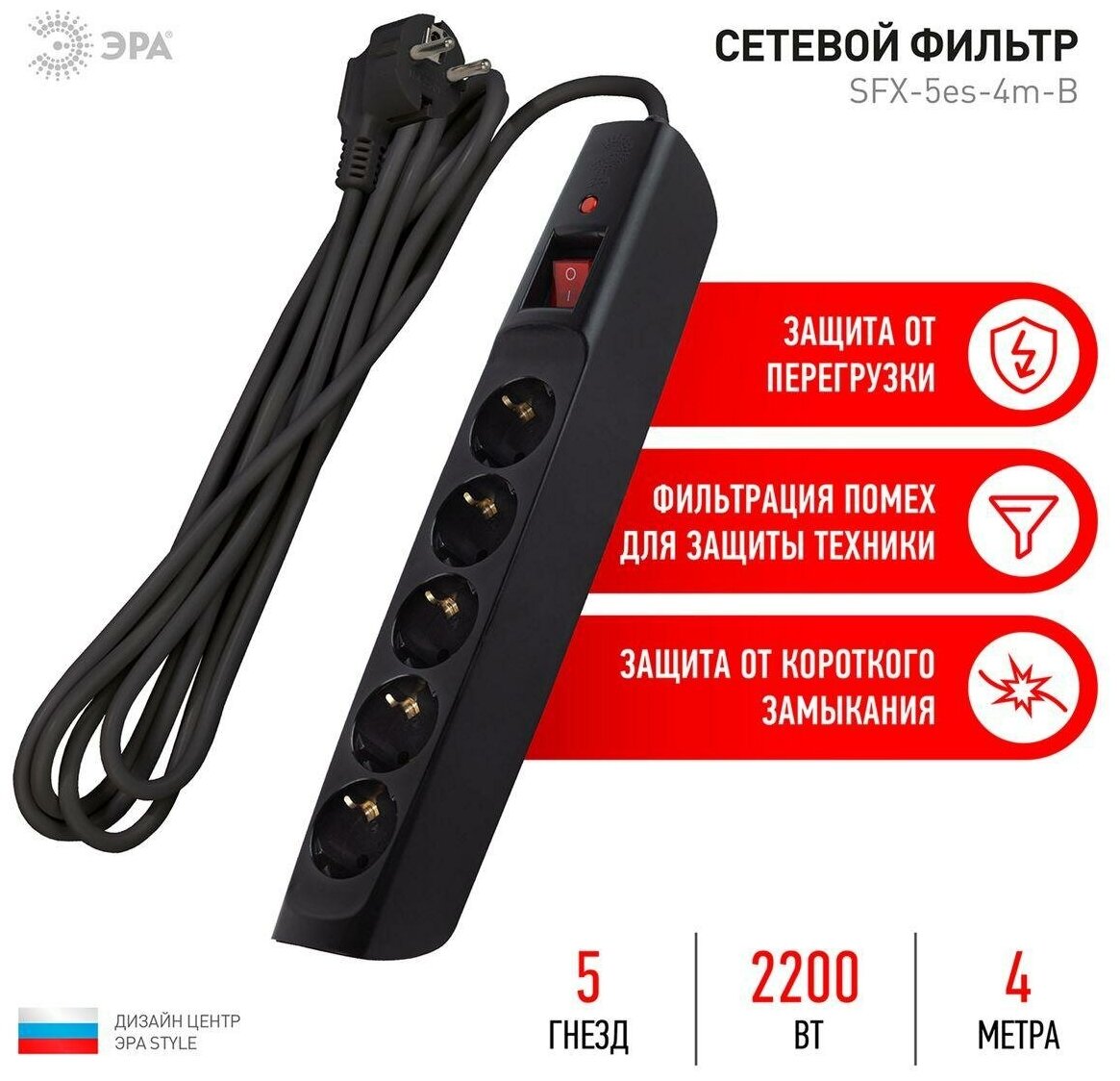 Эра Б0044022 Сетевой фильтр SFX-5es-4m-B черный с заземл, 10A, с выкл, 5гн, 4м информация: