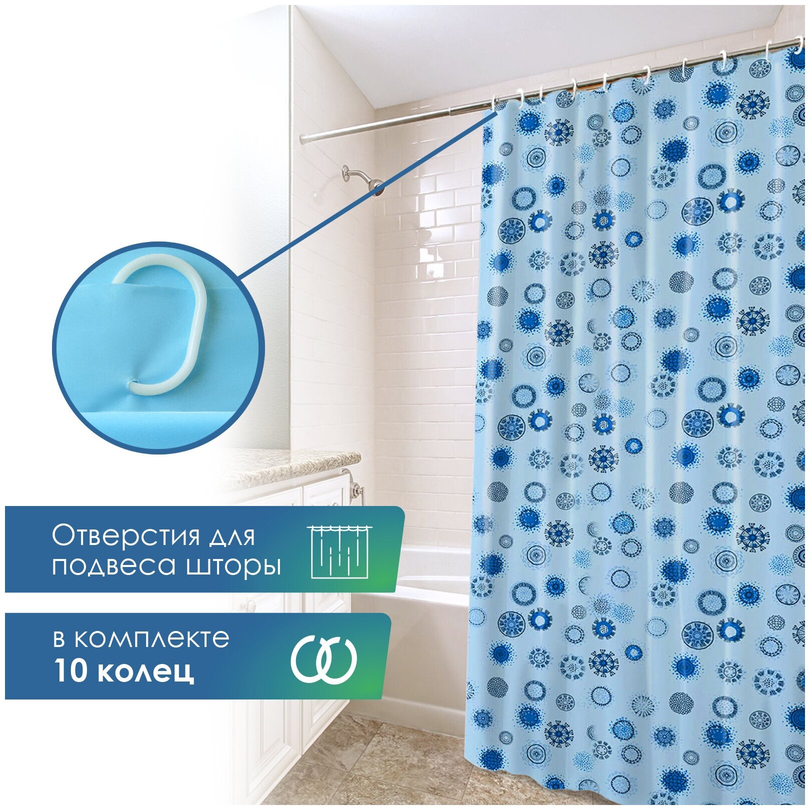 Штора для ванной комнаты VILINA водонепроницаемая с рисунком занавес с кольцами 180х180 см голубая