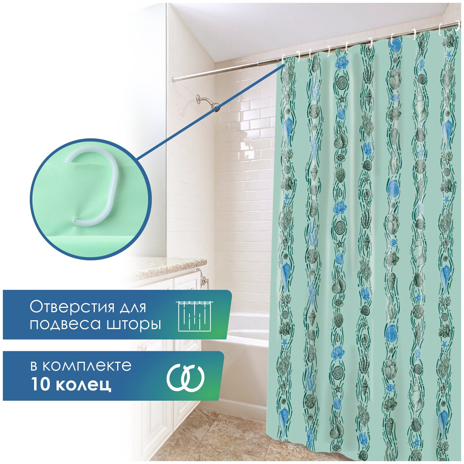 Штора для ванной комнаты VILINA водонепроницаемая с рисунком занавес с кольцами 180х180 см Ракушки зелёная 203 ₽