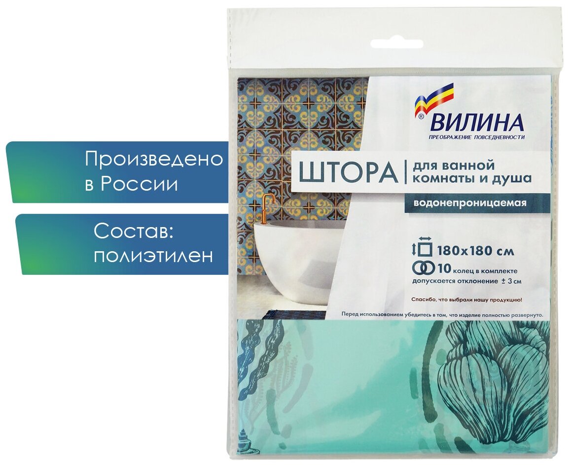 Отзывы на Штора для ванной комнаты VILINA водонепроницаемая полиэтиленовая 180х180 см Ракушки зелёные