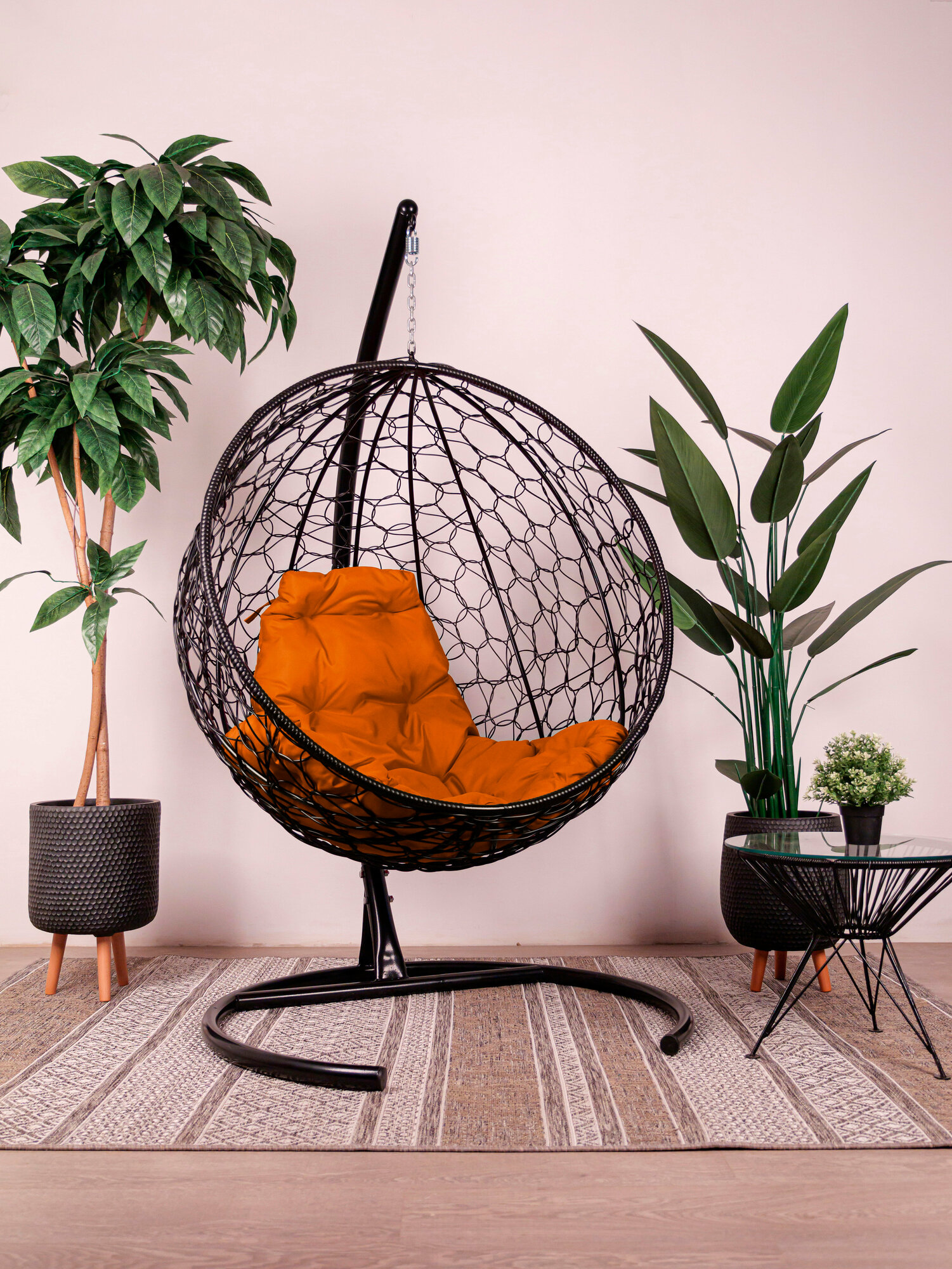 Подвесное кресло m-group круглый ротанг чёрное, оранжевая подушка