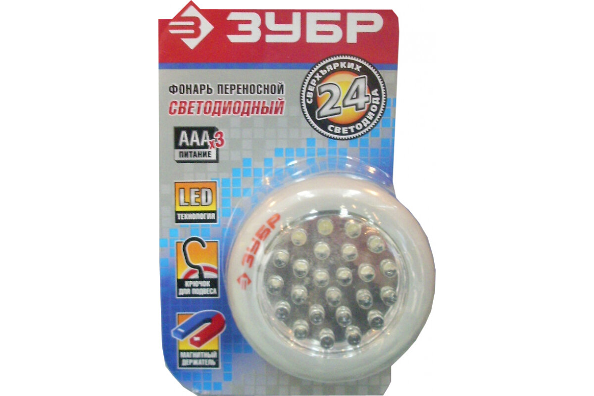 Фонарь светодиодный ЗУБР, 24 LED, магнит, крючок для подвеса, 3ААА (61812)