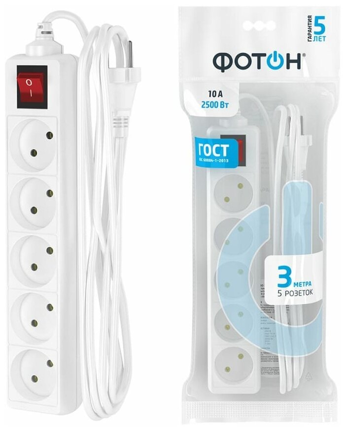Удлинитель сетевой "фотон" 10-35S, 3м, 5 розеток, белый, ГОСТ информация: