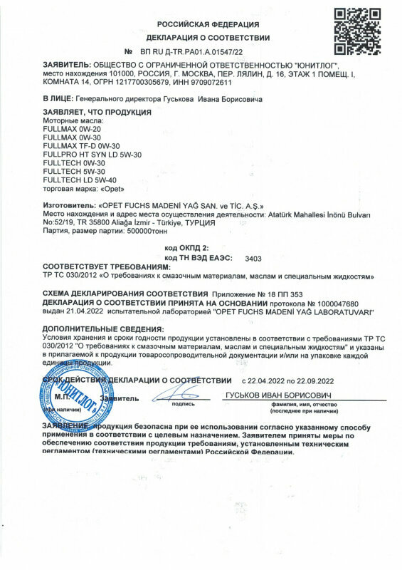 OPET Fulltech 5w30 Масло Моторное Синт. 5л. C3 Opet информация: