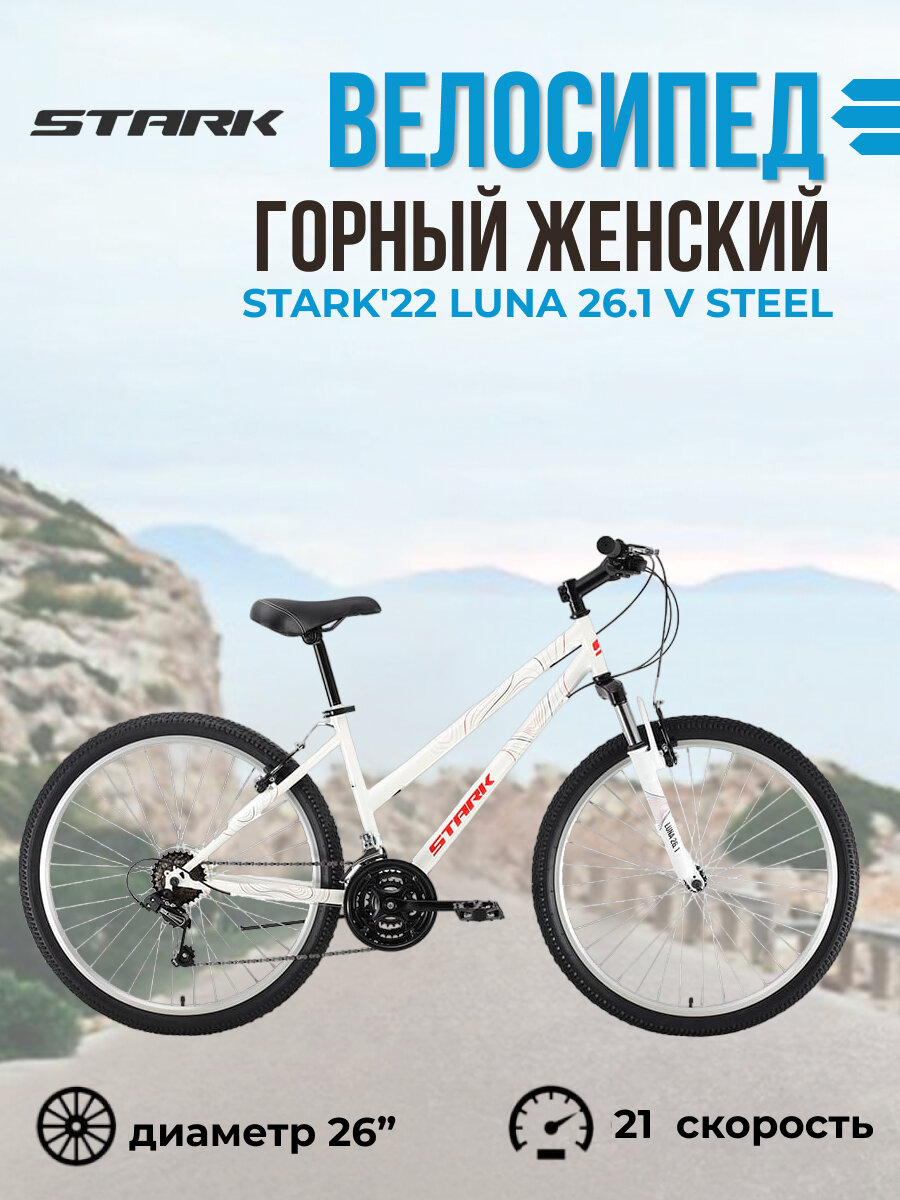 Женский горный велосипед Stark'22 Luna 26.1 V Steel бело-красный колеса 26", 21 скорость, рама XS (14.5"), 2022 год информация: