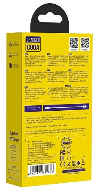 hoco C80A QC3.0, два выхода USB и Type-C, с кабелем Type-C на Type-C Сетевое зарядное устройство информация: