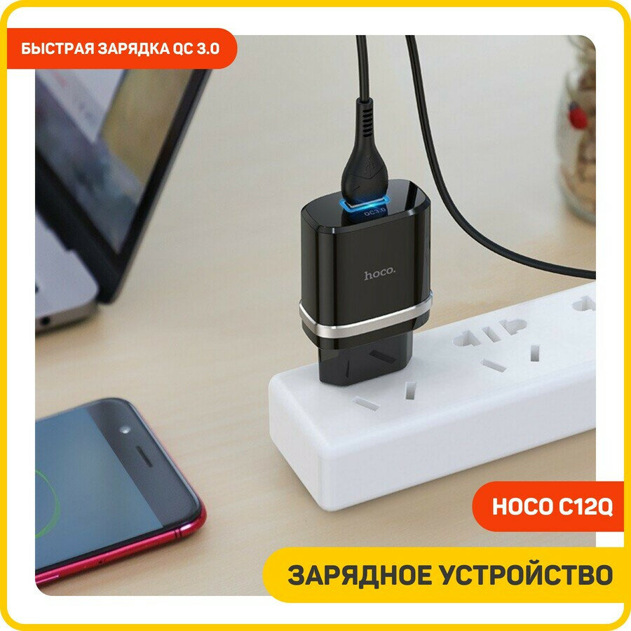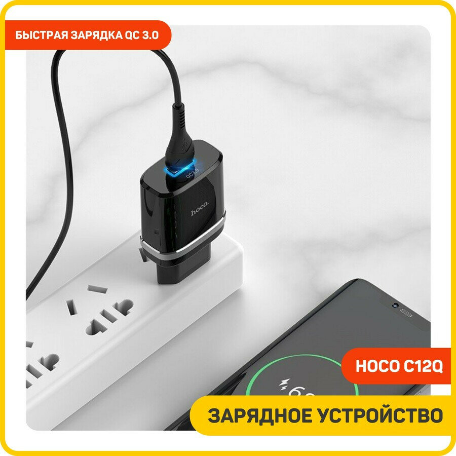 Зарядное устройство с быстрой зарядкой Hoco C12Q Smart QC3.0 charger + Type-C cable black 380 ₽