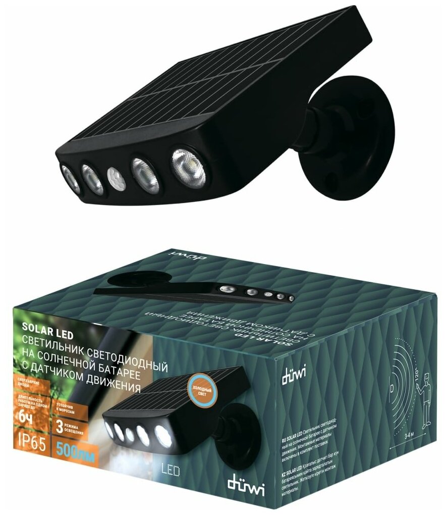 Светильник на солнечных батареях DUWI Solar LED 3 режима поворотный 4Вт 6500К 500Лм IP65 с датчиком движения черный 25027 2 информация: