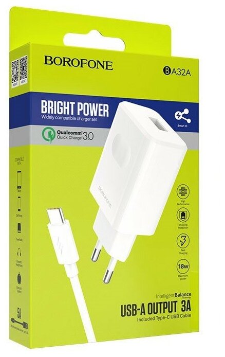Сетевое зарядное устройство BOROFONE BA32A Bright Power 1xUSB QC3.0, 18W, 3А + кабель Type-C, 1м, белый информация: