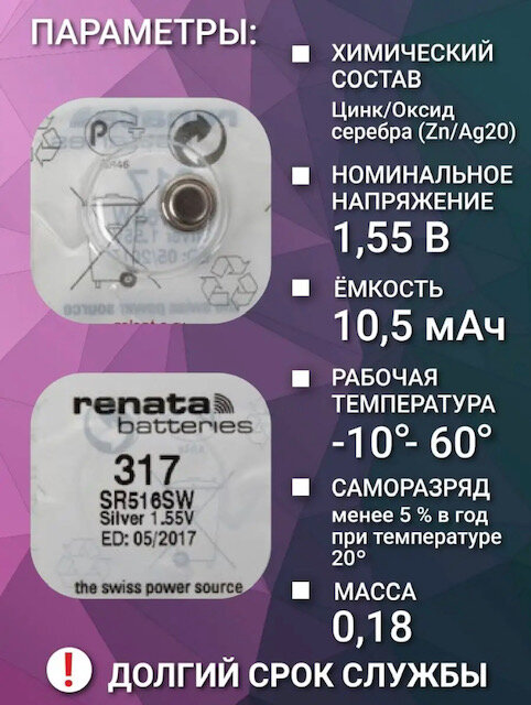 Renata / Батарейки Рената 317 круглые(2шт) информация: