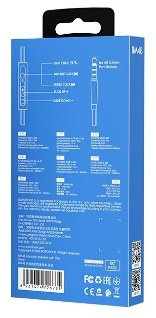Наушники внутриканальные Borofone BM48, ACOUSTIC, 1.2 м, цвет: серебряный