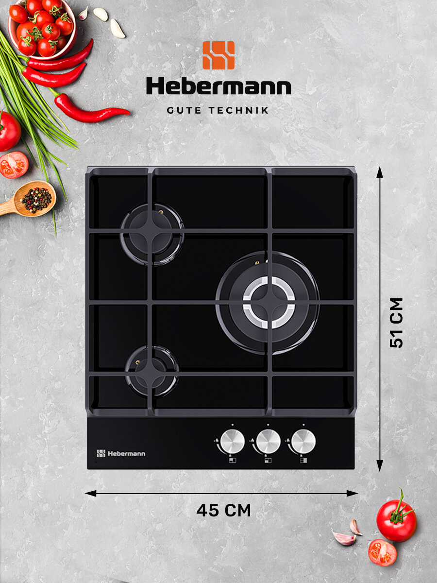 Варочная панель газовая 3 конфорки Hebermann HBGG 453.1 B,материал поверхности: закалённое стекло, материал решёток: чугун, термостойкие ручки -Hitech, электроподжиг, газ-контроль