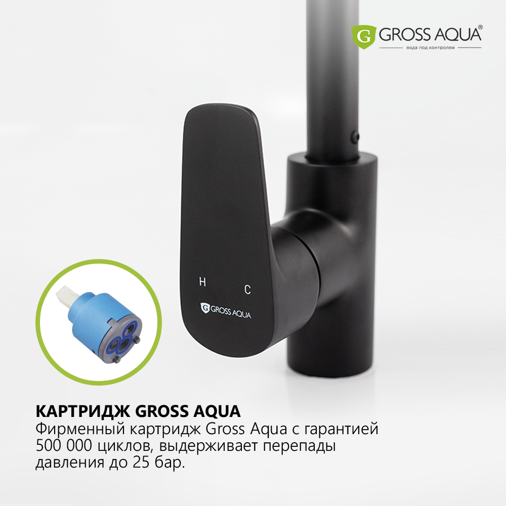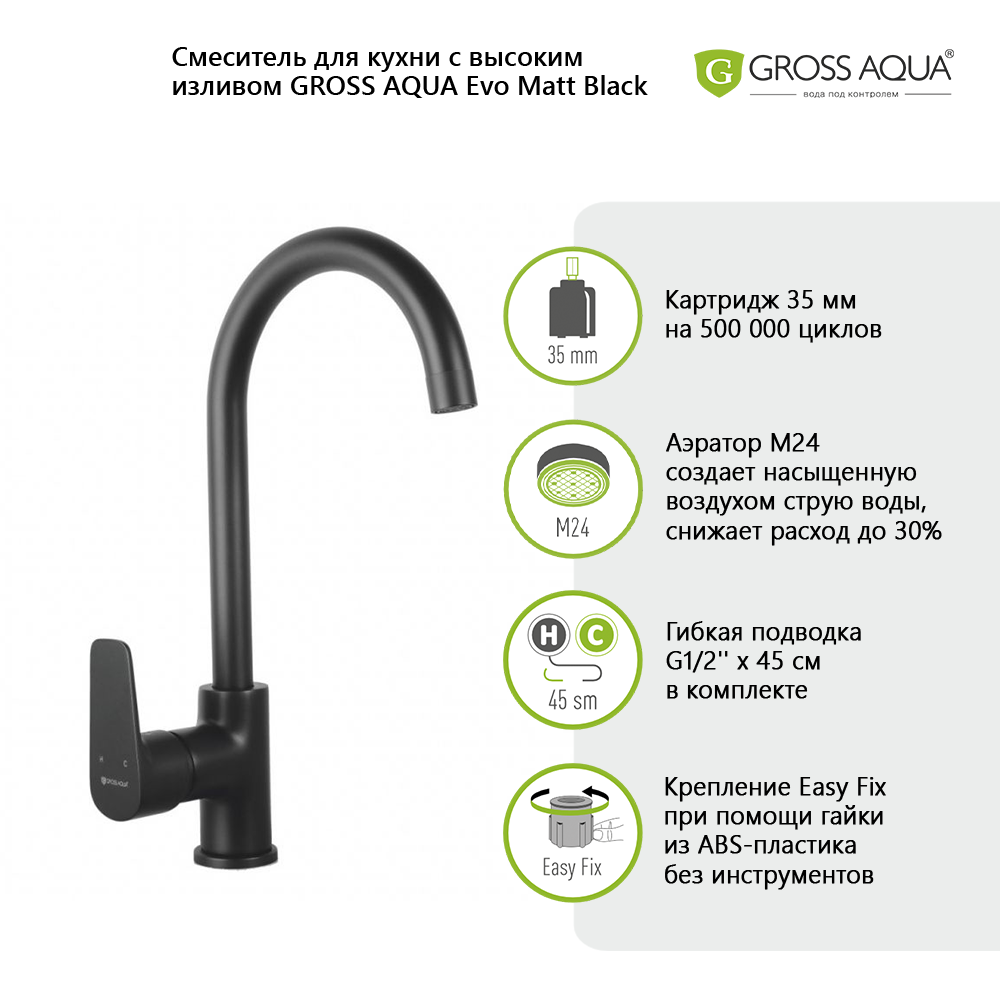 Смеситель для кухни с высоким поворотным изливом GROSS AQUA Evo, латунь, черный матовый, 3118297MB-В02.