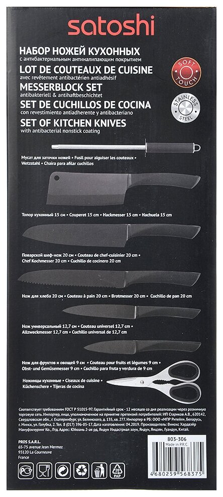 | Комплектация | мусат, кухонный топорик 15 см, шеф-нож 20 см, нож для хлеба 20 см, универсальный нож 12,7 см, нож для овощей и фруктов 9 см, ножницы, подставка |