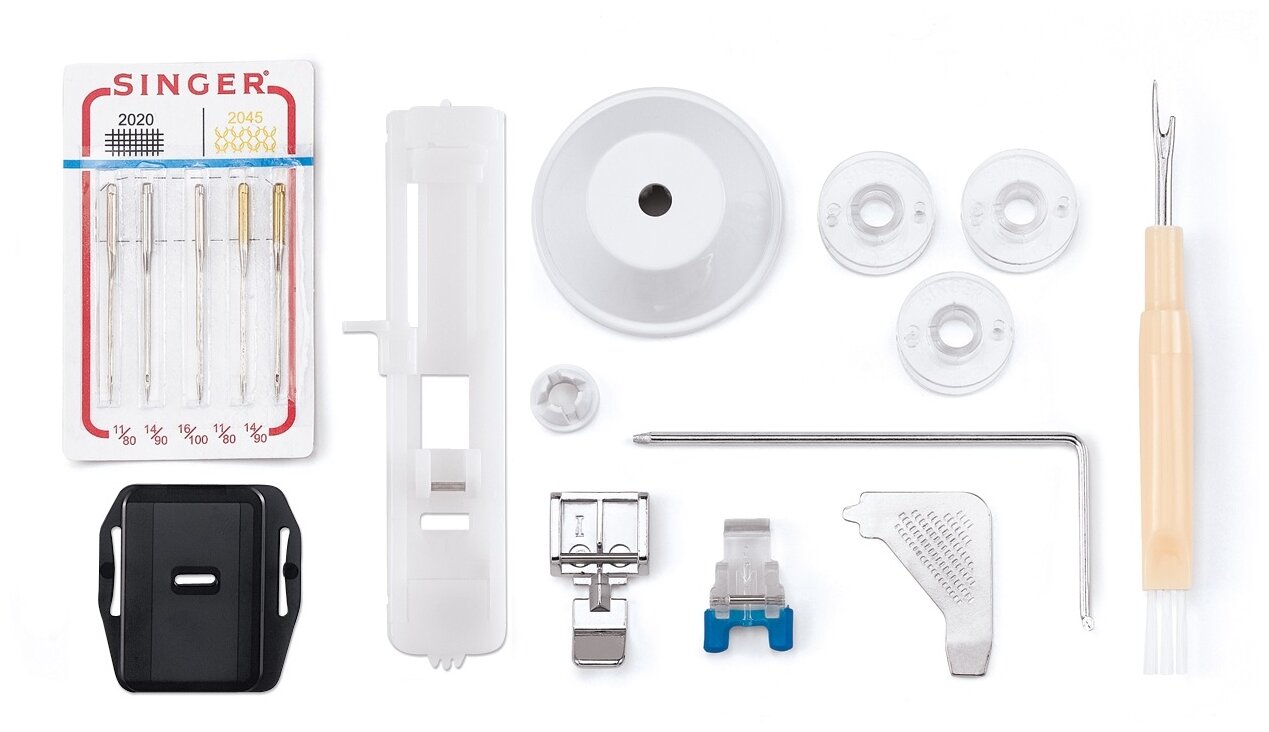 | Подробная комплектация | педаль, мягкий чехол, универсальная лапка, лапка для выполнения петли, лапка для пришивания пуговиц, лапка для молнии, пластина для штопки, прижимные диски для, катушки, отвертка, шпульки, иглы, распарыватель/кисточка, направитель для отстрочки |