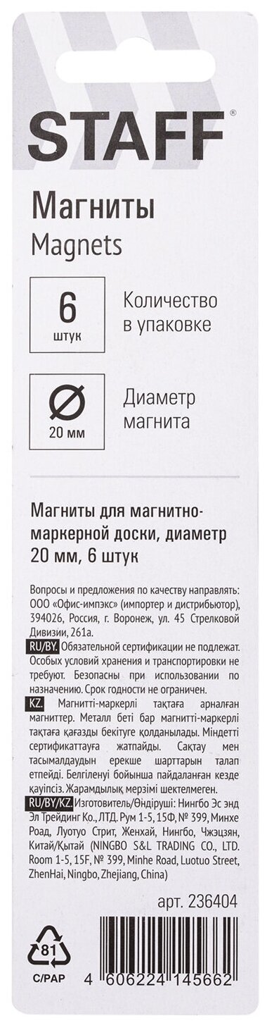 10 цен на Магниты малого диаметра, комплект 6 шт., 20 мм, цвет ассорти, в блистере, STAFF "Basic", 236404