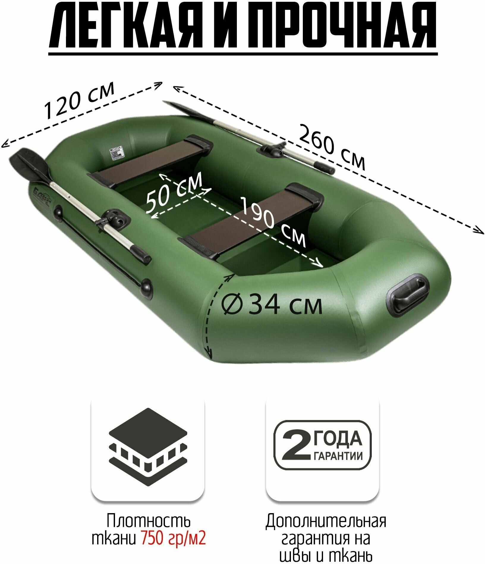 Лодка надувная для рыбалки Барс-260, ПВХ, двухместная, зелёный
