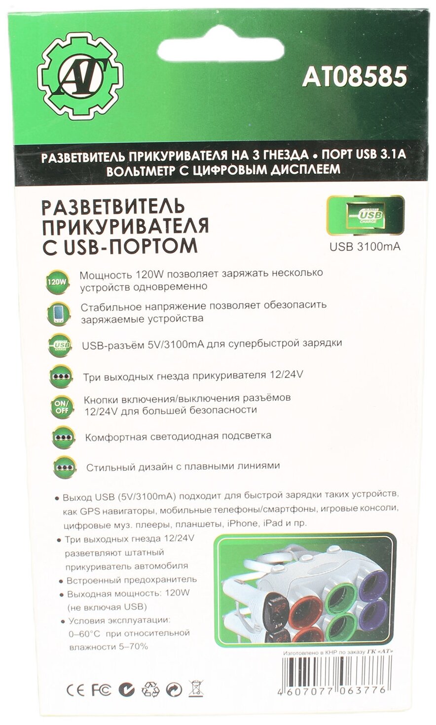 Разветвитель прикуривателя 12/24V на 3 гнезда 120W, вольтметр и 1USB разъем 5V-3.1А, с выкл. информация:
