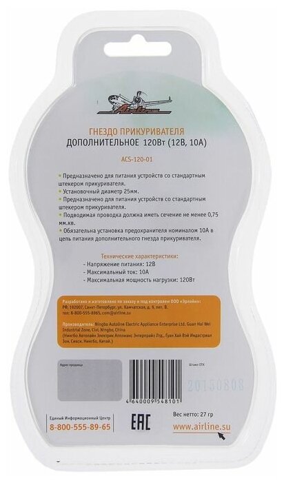 AIRLINE Гнездо прикуривателя Airline, 120 Вт, 12 В, 10 А