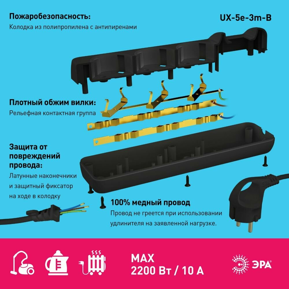 Отзывы на Удлинитель электрический UX-5e-3m-B с заземлением 5 розеток 3м ПВС 3х0.75мм2 10А черн. Б0057725 Эра