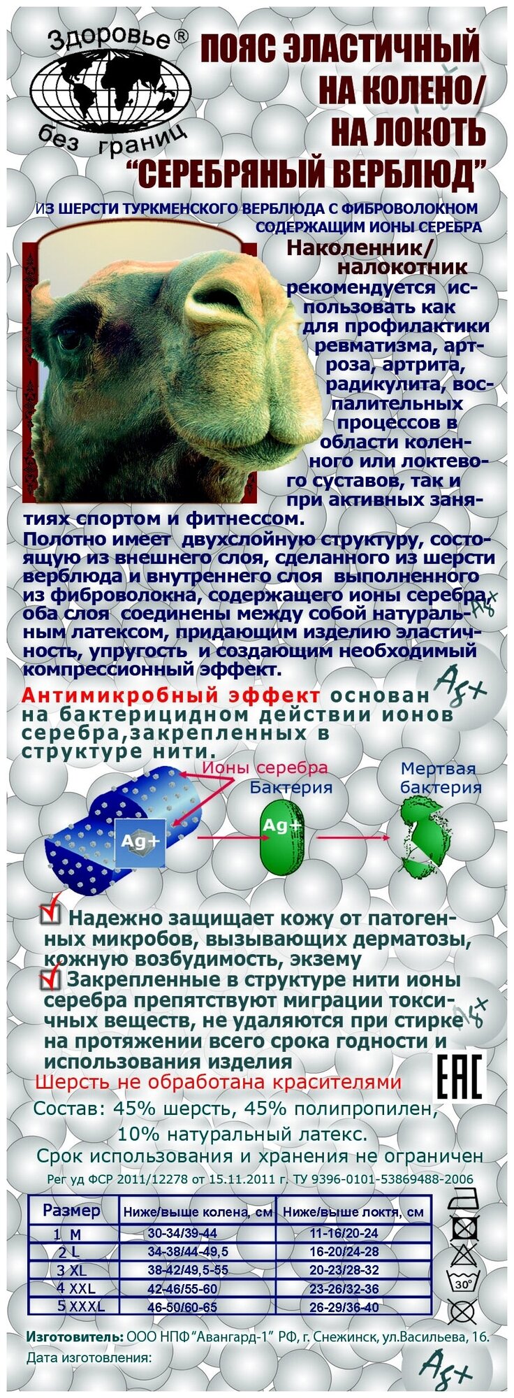 Бандаж на колено/локоть Серебряный Верблюд эластичный с верблюжьей шерстью и ионами серебра, № 4 (42-46/55-60 см)