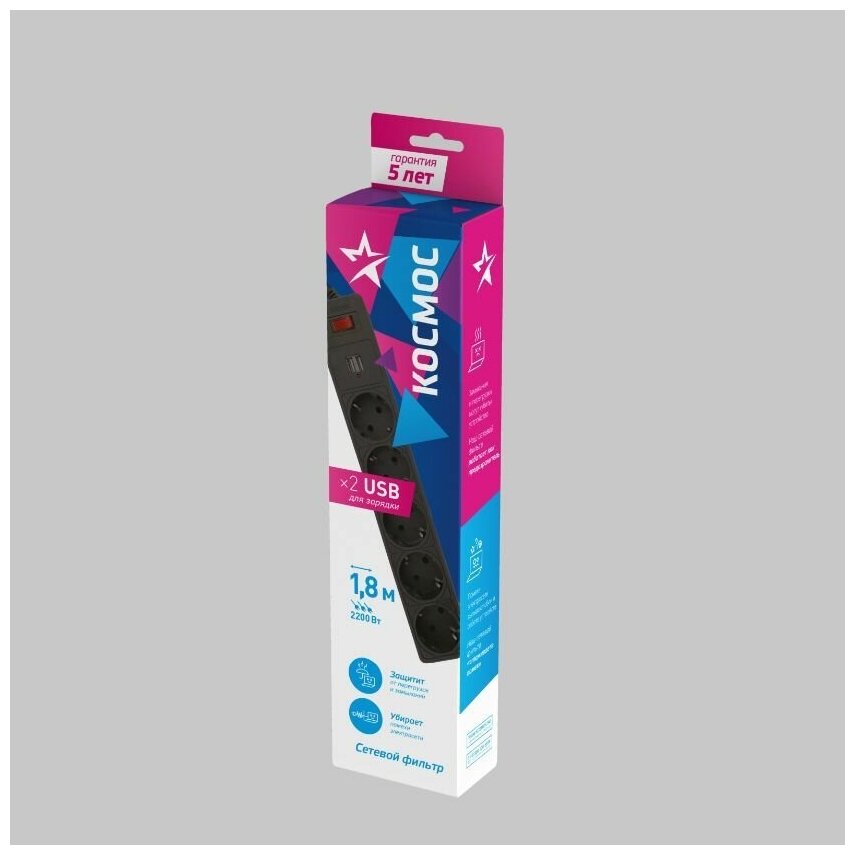 Удлинитель с сетевым фильтром 5х1.8м с заземл. 10А IP20 2.2кВт 2хUSB 3х0.75 с предохранителем космос FKsm1.8m-5g(W)USB