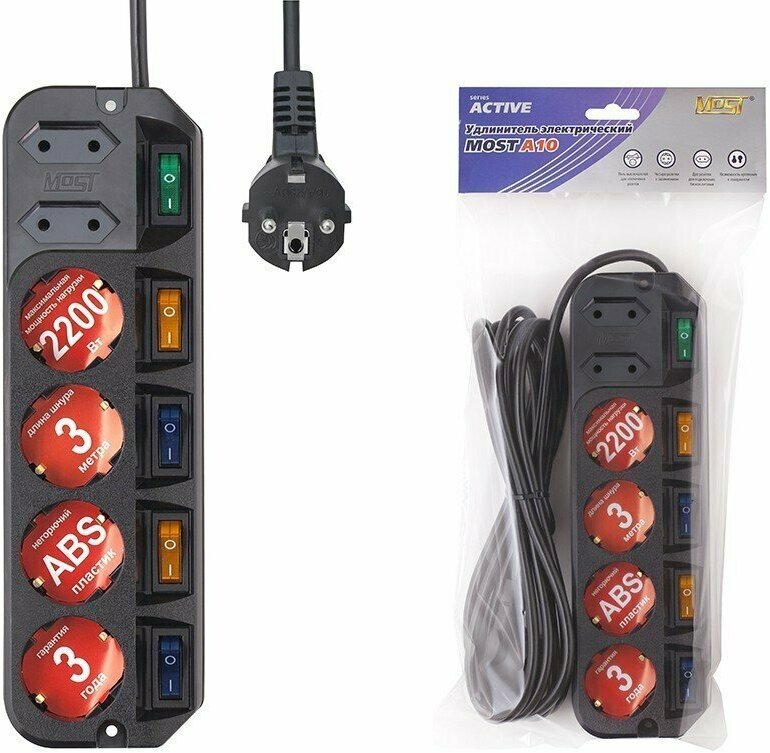 Удлинитель MOST Active A10, 6 розеток, с/з, 10А / 2200 Вт черный 1.6 м 250 мм 75 мм 45 мм 0.75 м² 6