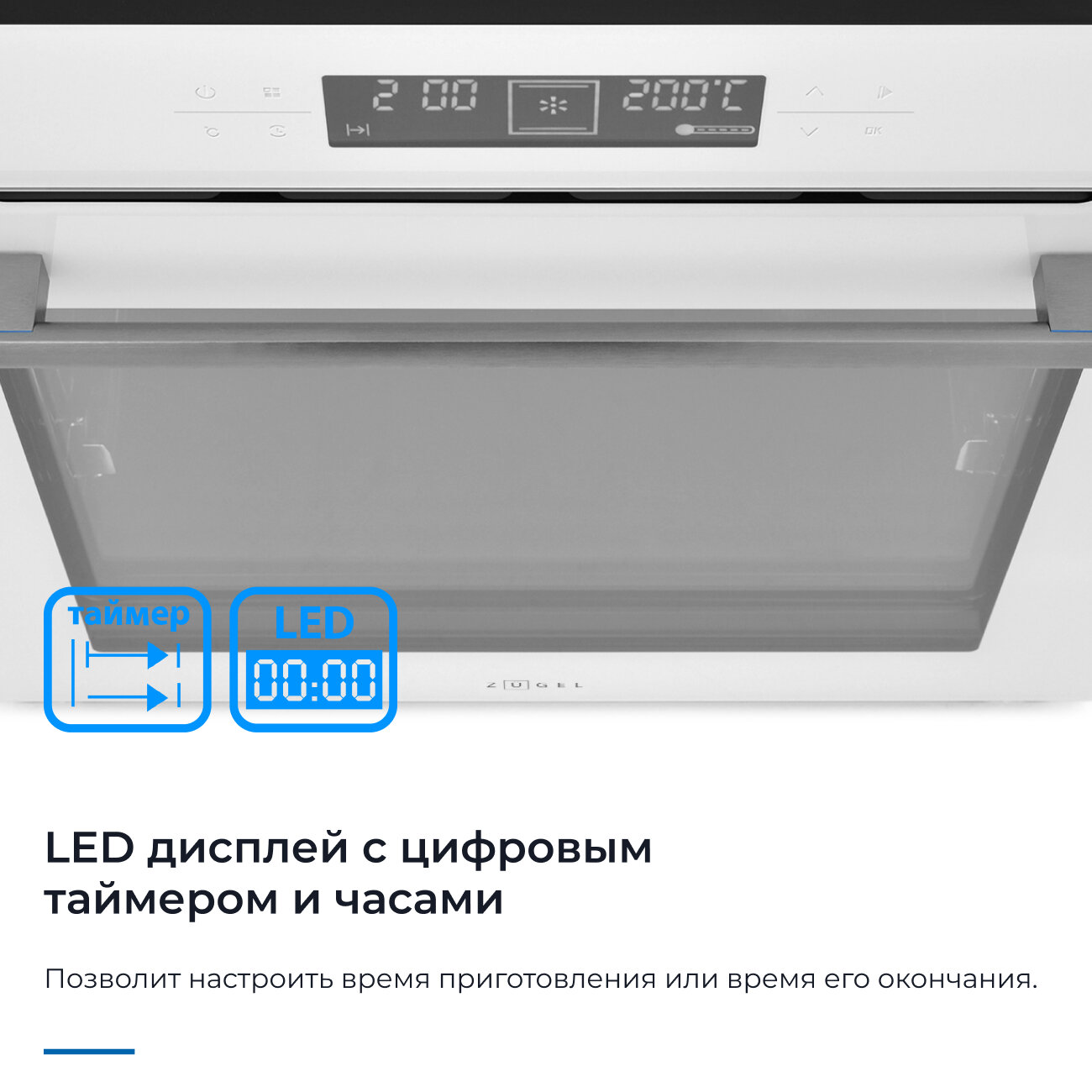 Духовой шкаф электрический встраиваемый ZUGEL ZOE601W, 9 режимов работы, 3D-нагрев, сенсорный дисплей, термощуп, белый 51 590 ₽