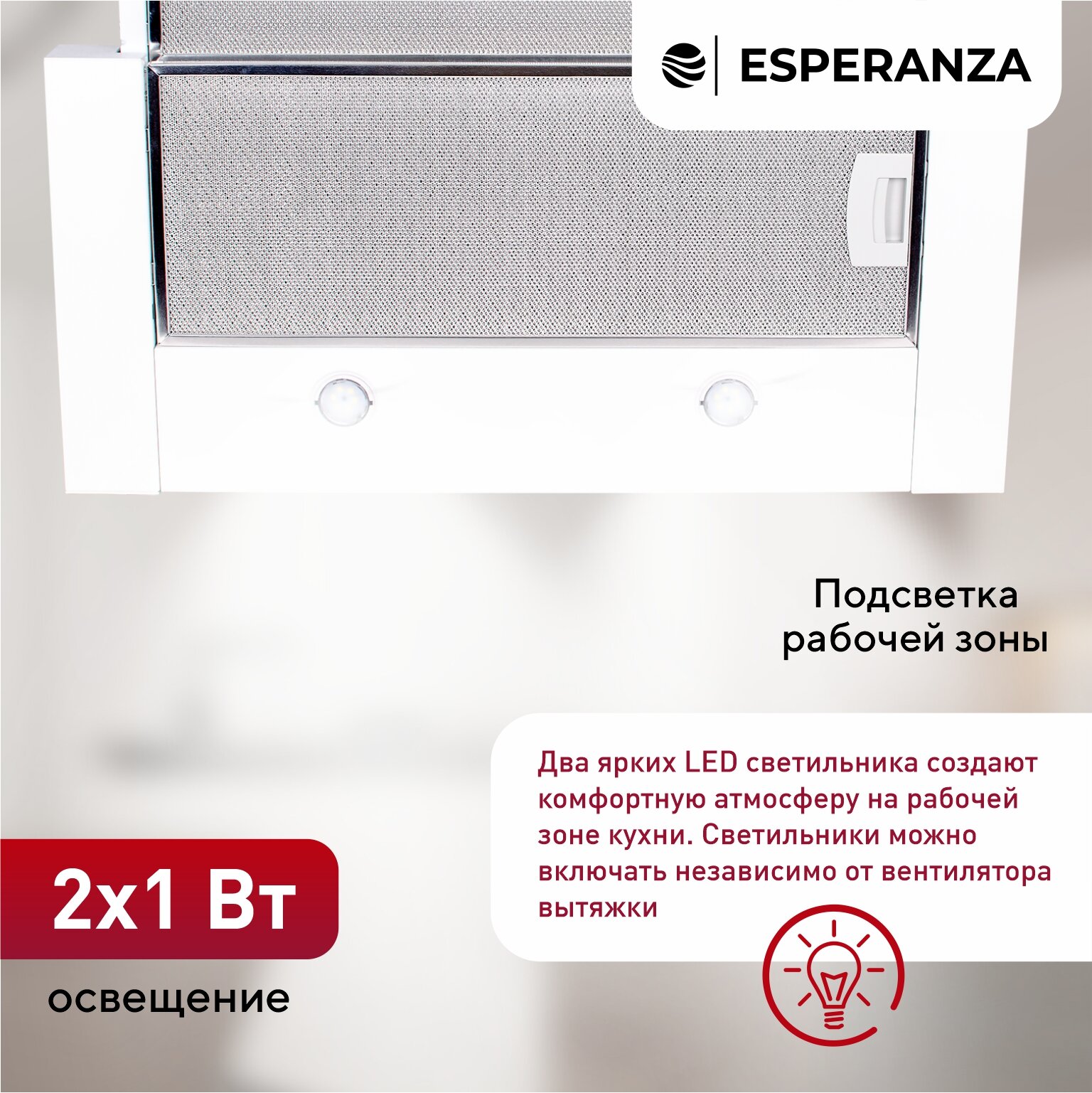 Вытяжка кухонная встраиваемая на 60 см ESPERANZA RHT60S01 W, производительность 450 м3ч, гарантия 5 лет, белый 7 650 ₽