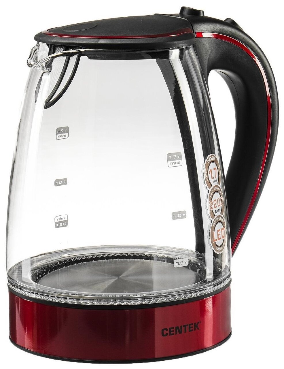 Чайник Centek CT-1009 BLR /красный-черный стекло, 1,7л., 2200Вт,