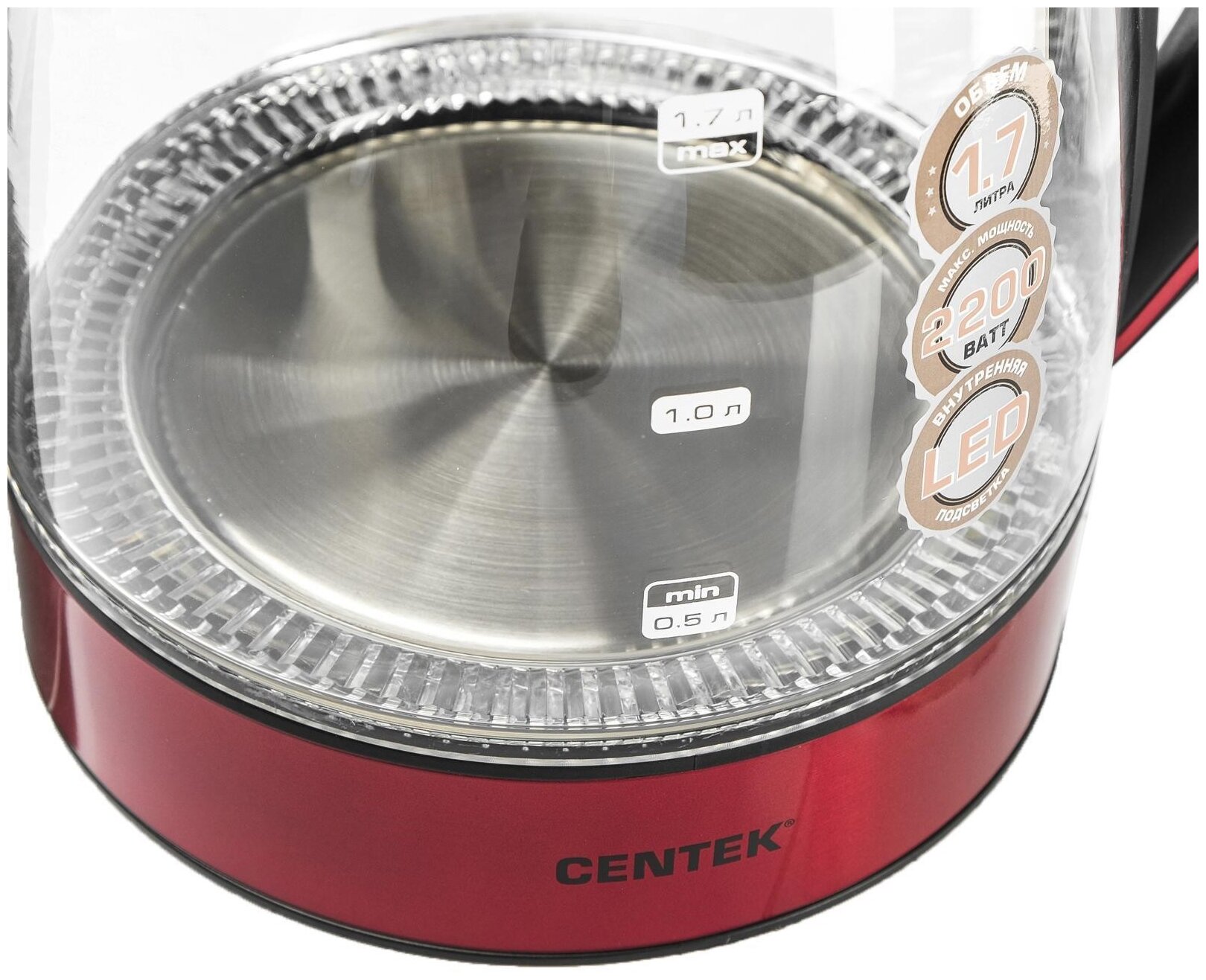 Чайник Centek CT-1009 BLR (красный/черный) стекло, 1.7л, 2200Вт, внутренняя LED подсветка, кнопка