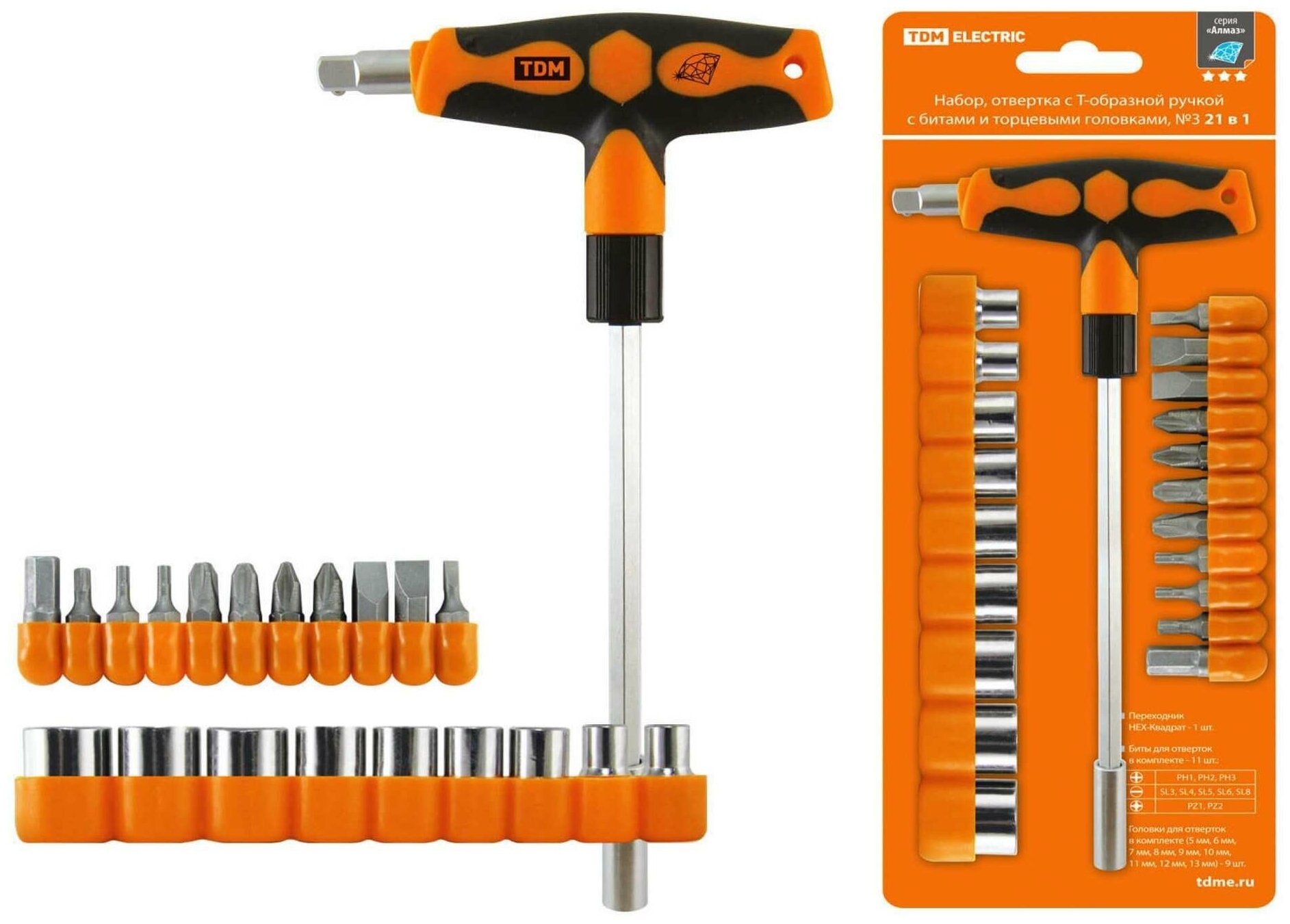 Набор, отвертка с Т-образной ручкой с битами и торцевыми головками, №3, 21 предмет "Алмаз", TDM SQ1019-0203 (1 шт.)