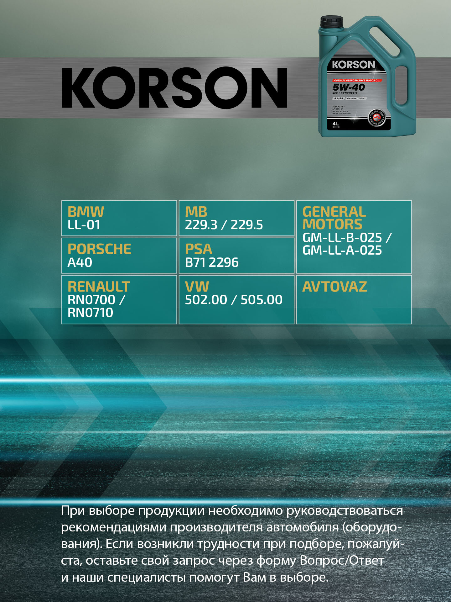 10 цен на 5W-40 SEMI SYNTHETIC A3 B4 4л (полусинт. мотор. масло) KORSON KS00082