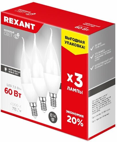 Светодиодная лампа Rexant E14, 7.5 Вт, 713 Лм (=60 Вт), 4000 K (нейтральный свет), упаковка 3 шт.