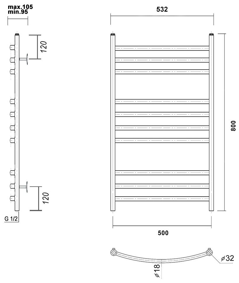 | Дополнительная информация | Полотенцесушитель 1 шт., Крепление телескопическое 4 шт., Заглушка 1 шт., Кран Маевского 1 шт., Угловой переходник HP-НP 1/2*3/4 - 2 шт., Паспорт на изделие. |