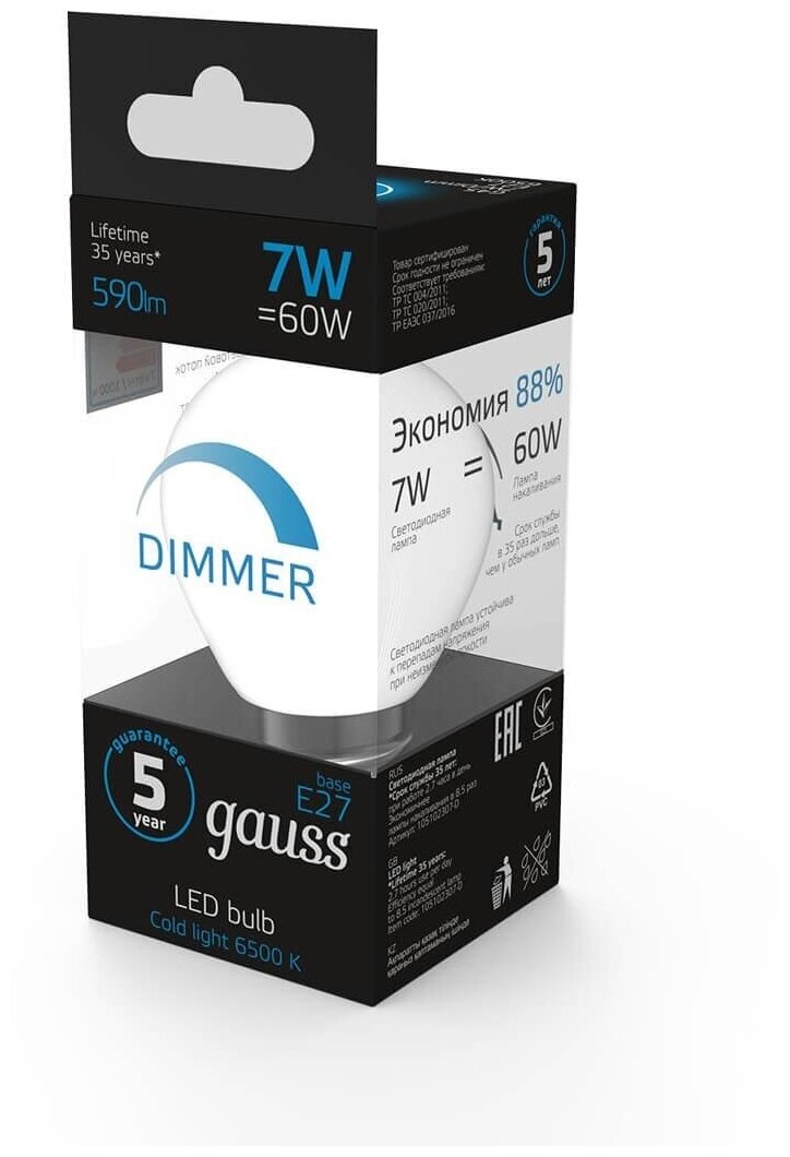 Отзывы на Gauss Лампа Шар 7W 590lm 6500К E27 диммируемая LED 1/10/100 105102307-D