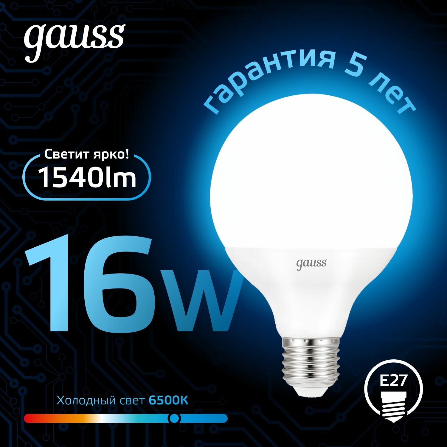 Лампа GAUSS G95 16W 1400lm 6500K E27 LED 1/20 105102316