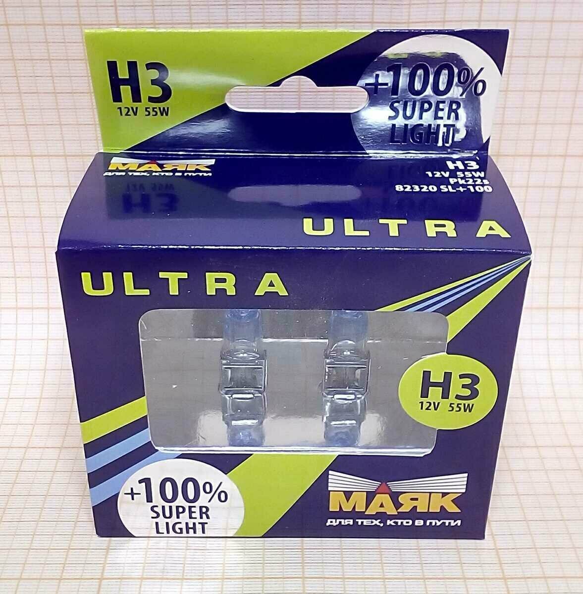 10 цен на Лампа Н3 12V 55W маяк PK22s галогенная ULTRA Super Light +100% (2 шт), H3