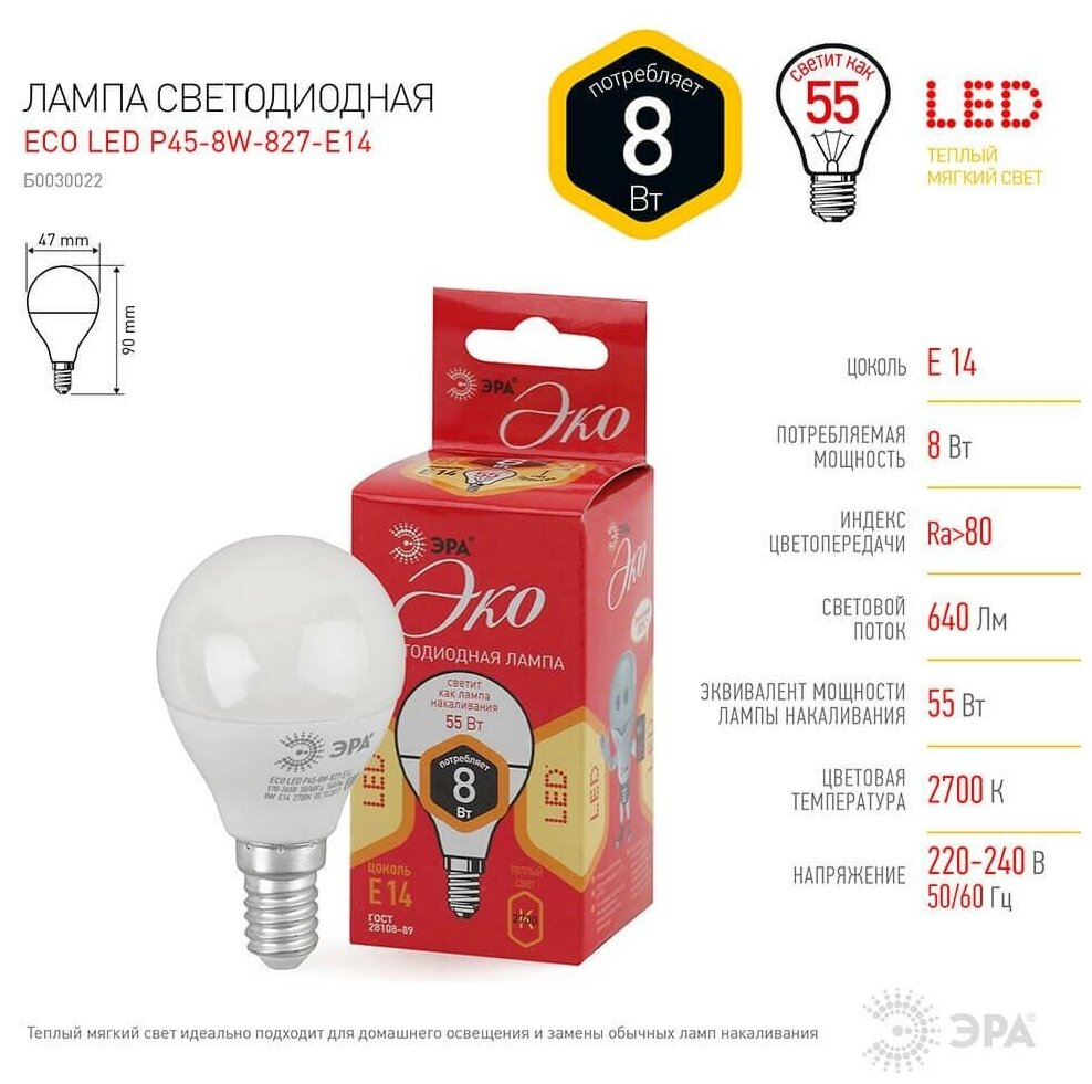 ECO LED P45-8W-827-E14 (диод, шар, 8Вт, тепл, E14), ЭРА Б0030022 (1 шт.)