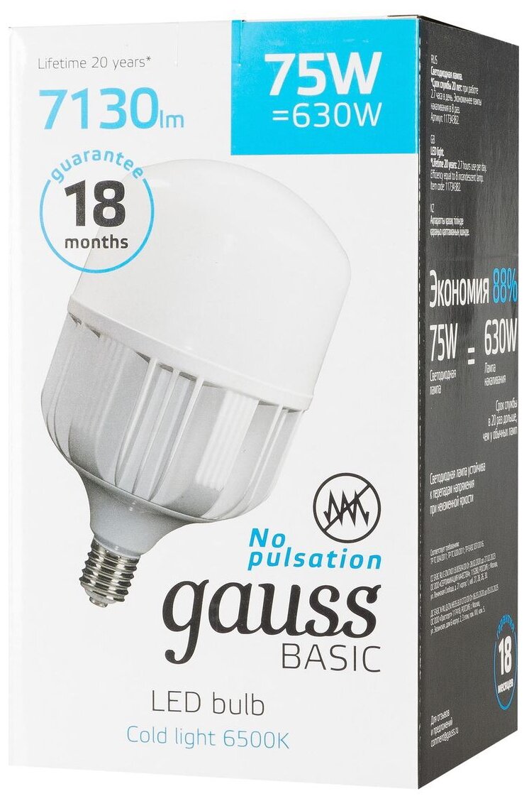 Лампа светодиод 75Вт дрл/дрв Е40 6500К 7130Лм Т140 AC180-240V Gauss Basic информация: