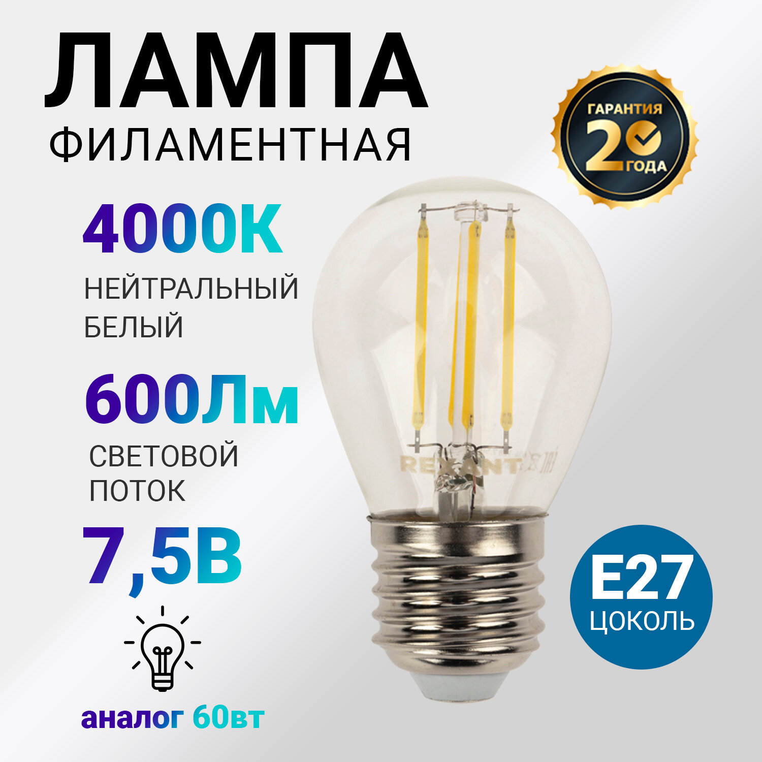 Отзывы на Лампочка филаментная REXANT Шарик GL45 7.5 Вт 600 Лм 4000K E27 диммируемая, прозрачная колба