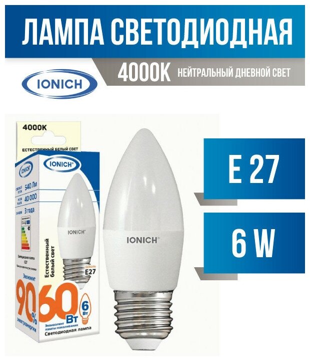 IONICH свеча C37 E27 6W(540lm) 4000К 4K пластик/алюм 1532 (арт. 728711)