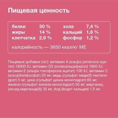 | Состав | дегидрированное мясо курицы, маис, ячмень, куриный жир, дегидрированное мясо ягненка ( 4%), свекольный жом, пивные дрожжи, лецитин, шиповник, локсидан |